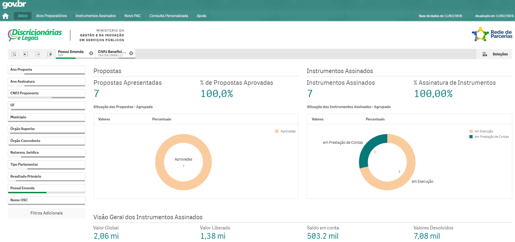 Em atendimento ao estabelecido no Art. 40-A, da Portaria Conjunta MF/MPO/MGI/SRI-PR Nº 115, de 10 de dezembro de 2024, a Associação Gol de Ouro disponibiliza abaixo a consulta ao Painel de Transparência Discricionárias e Legais, do Ministério da Gestão e da Inovação em Serviços Públicos (MGI).